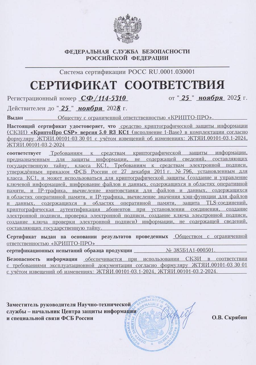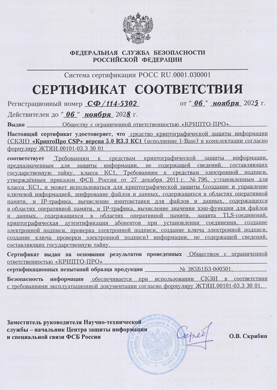 СКЗИ «КриптоПро CSP» версия 5.0 R3.3 КС1 (исполнение 1-Base)