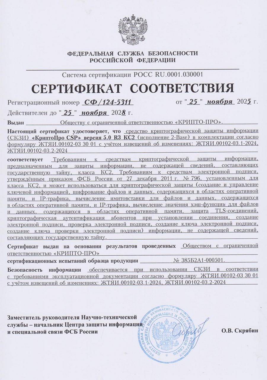 СКЗИ «КриптоПро CSP» версия 5.0 R3 КС2 (исполнение 2-Base)