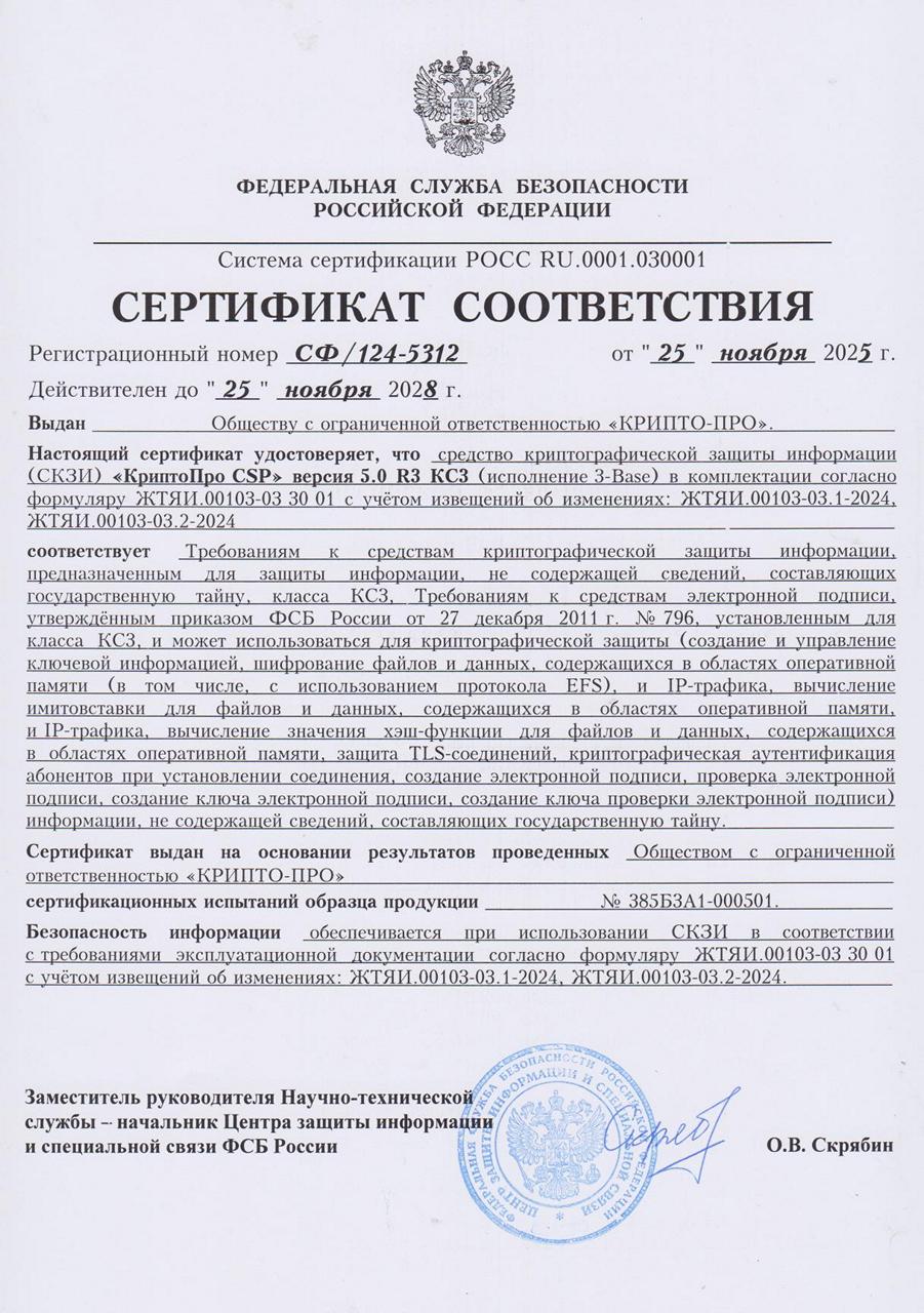 СКЗИ «КриптоПро CSP» версия 5.0 R3 КС3 (исполнение 3-Base)