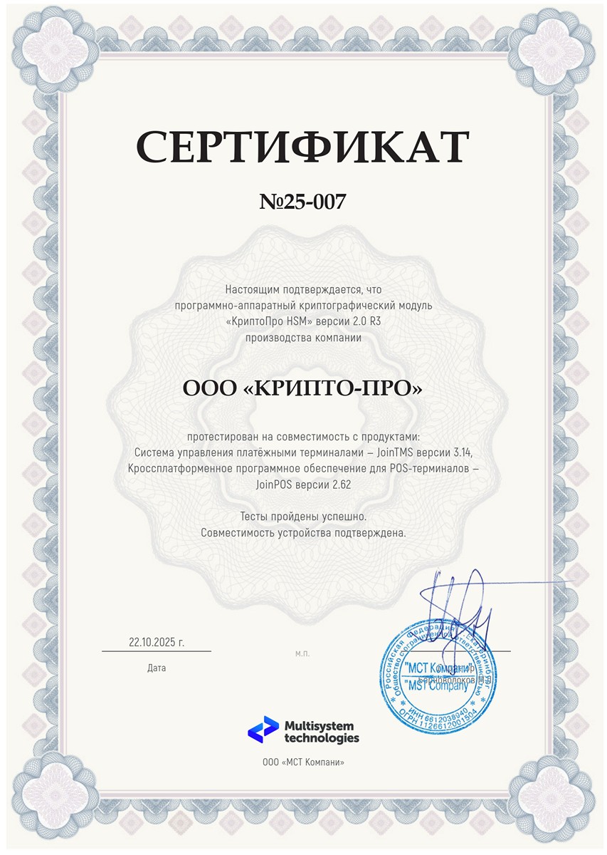 Сертификаты совместимости с банковскими системами