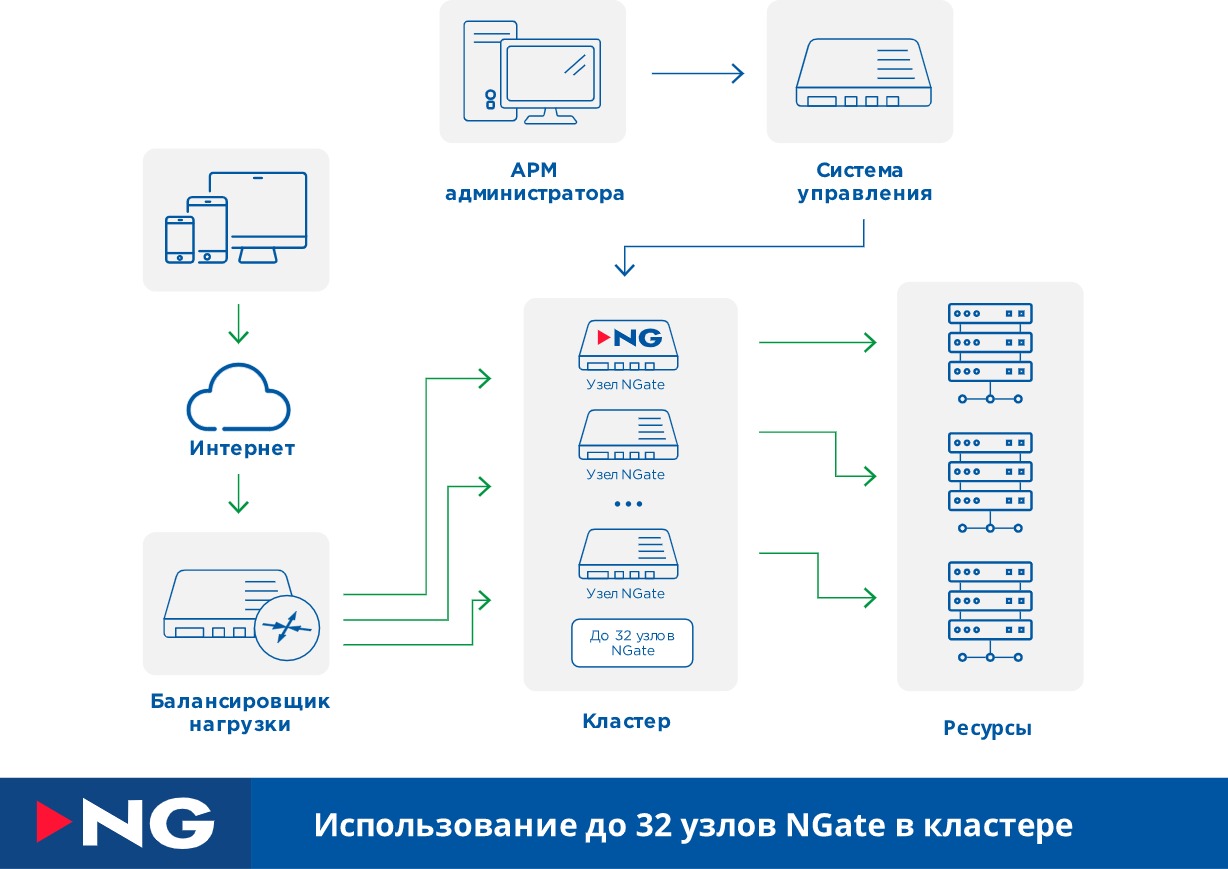 Масштабируемость. NGate гибко масштабируется и может применяться в различных сценариях. Шлюз обеспечивает возможность увеличения пропускной способности за счет объединения аппаратных мощностей в кластерную конфигурацию. Решение поддерживает работу в схеме высокопроизводительного кластера (до 32 узлов) с балансировкой нагрузки с полной синхронизацией сессий. При этом выход из строя какого-либо узла кластера не приводит к разрыву соединений, поскольку данные о сессии синхронизируются между устройствами балансировщиком и соединение перераспределяется на свободные узлы кластера.